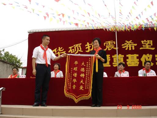情系灾区援手共建家园 “华硕抗震希望小学”奠基动土 2008年9月23日,“华硕抗震希望小学”的奠基、动土仪式在四川中江县东北镇举行。中江县教育局局长郑大明代表中江县东北镇小学校接受了华硕电脑捐建资金150万元,该笔捐助款项将帮助东北镇小学灾后重建一幢崭新的教学楼。东北镇中心学校校长顾炳荣代表学校接受华硕电脑员工捐赠的价值15万元的多媒体教学设备,此捐赠为帮助东北镇小学建设良好的教学环境。