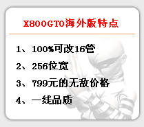 蓝宝石X800GTO海外版拥有强劲的性能,其256Bit显存的架构在游戏里面拥有明显的优势。根据专业媒体的测试结果显示,这款产品无论在3DMARK系列的理论测试还是实际游戏中均有优异的表现。即使面对1280x1024这样的17寸液晶最佳分辨率的时候仍然拥有强劲的表现。而修改之后的GTO海外版的性能更是会有一个可观的性能提升,性能远远超越6800/6600GT等显卡。根据权威媒体的测试表明,打开16管线之后的X800GTO海外版在最新的极品飞车9游戏里面领先6800/66GT的性能最多达到了25%之多!是目前千元以内显卡当之无愧的性能之王!而且这款蓝宝石X800GTO海外版更是出产之全球ATI最大合作伙伴蓝宝之手,品质上面绝对有保障的。